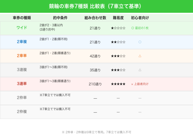 競輪の車券は7種類ありますが、7車立てで買えるのは5種類。初心者はまずワイド1〜2点から始めるのがおすすめです。的中率・平均配当・ステップアップの順序を全て解説します。