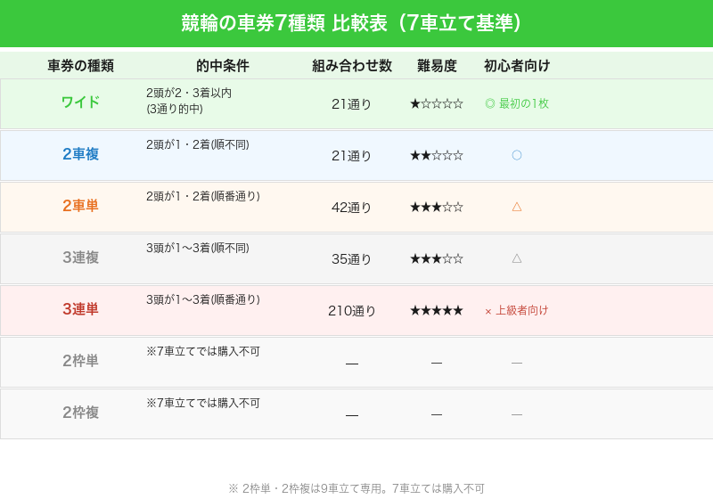 | 車券 | 的中条件 | 組み合わせ数(7車) |